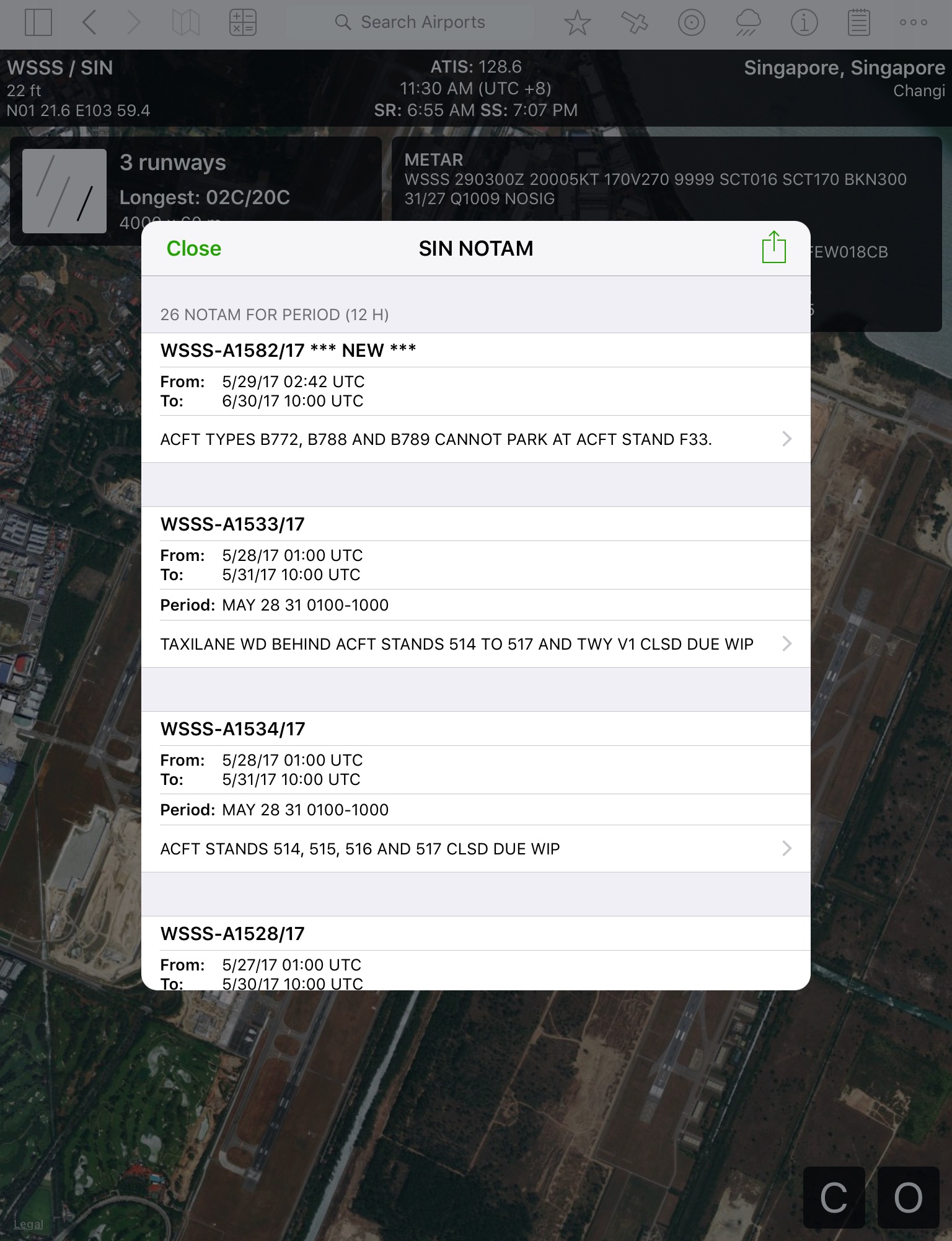 You will also be able to retrieve NOTAMs for the airport. I am not sure how your Computer Flight Plan looks like at your airline, but the information presented in the Airports app is way easier for me to digest. I’ll usually read the NOTAMs at home with the Airports app, and when I get to work, I’ll cross-check against the NOTAMs printed by my Airline’s despatch.