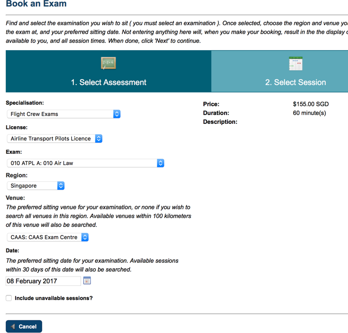 9 In “Specialisation”, Select Flight Crew Exams if you are taking papers for pilot certifications. Select the type of licence, the paper you intend to take, the region and venue of the desired exam center and the rough date of your desired exam date. The date does not matter that much because on the next page you’ll be able to scroll forward and back on a calendar. Click Next.